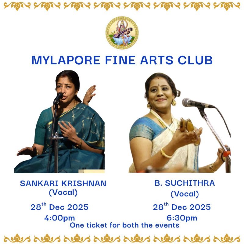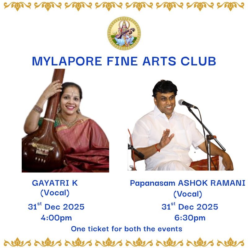 Mylapore Fine Arts-4pm-K. GAYATHRI (Vocal) ; 6:30pm-Papanasam ASHOK RAMANI (Vocal)