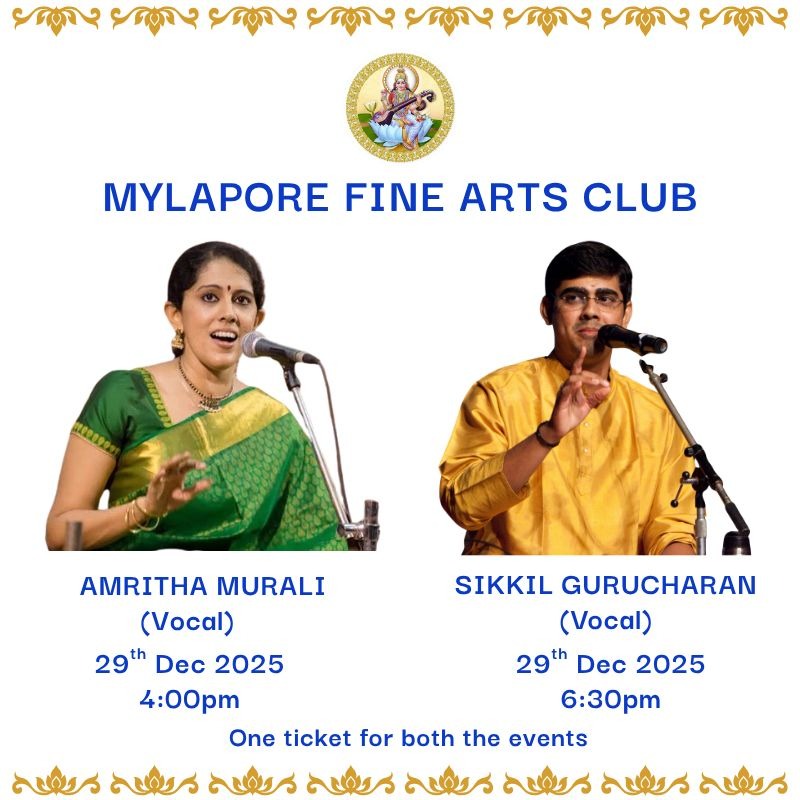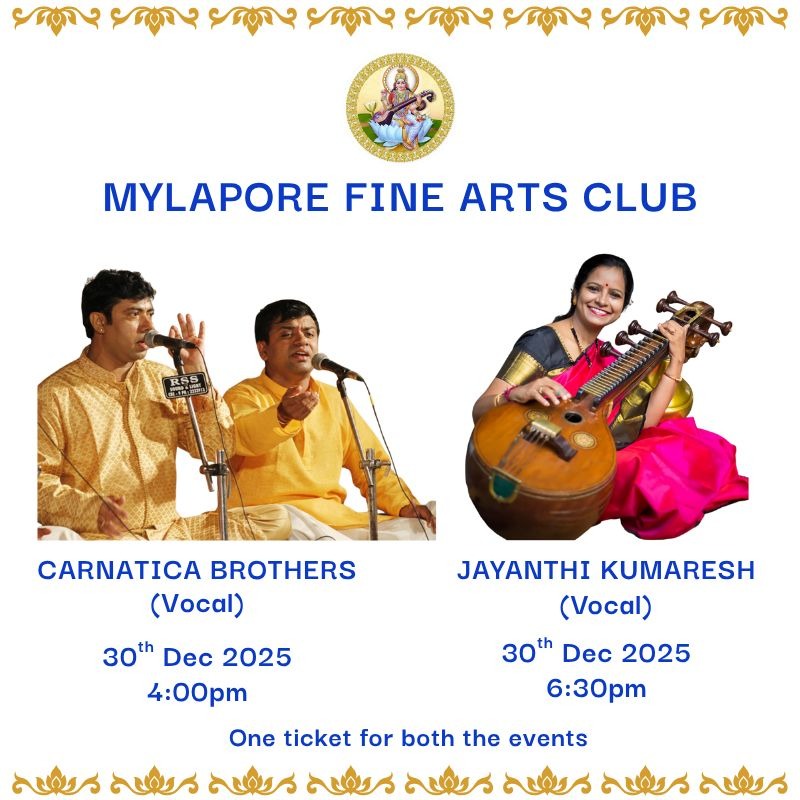 Mylapore Fine Arts-4pm-CARNATICA BROTHERS; 6:30pm-JAYANTHI KUMARESH (Veena)