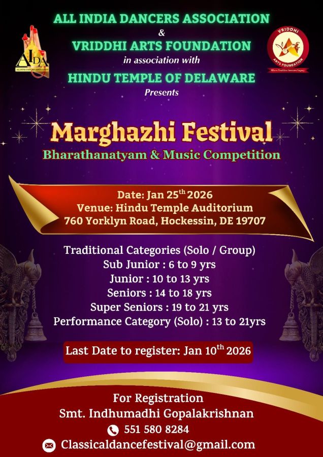 Vriddhi Arts Foundation hosts Marghazhi Festival-Bharathanatyam & Music Competition Marghazhi Festival Bharathanatyam & Music Competition , Venue: Hindu Temple Auditorium 760 Yorklyn Road, Last Date to register: Jan 10th 2026